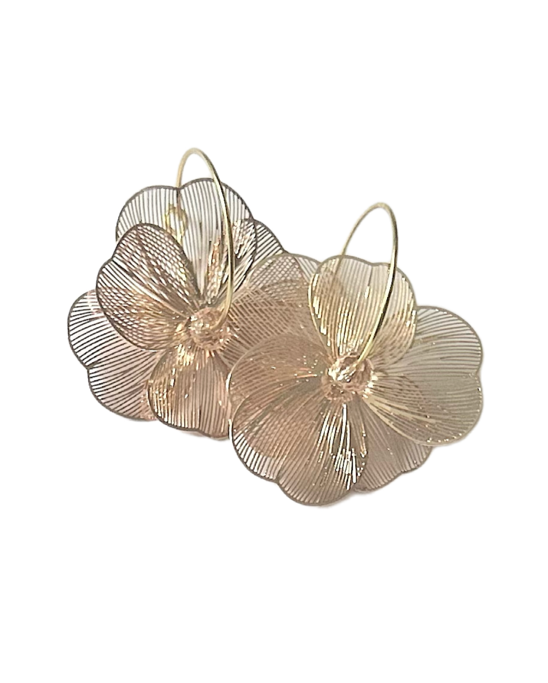 «Colección Luz de Navidad». Aretes de tamaño medio con flor labrada y abalorio en color cuarzo rosa semitransparente. No pesan nada. Diseño original de Alma y Capote. Piezas únicas.
