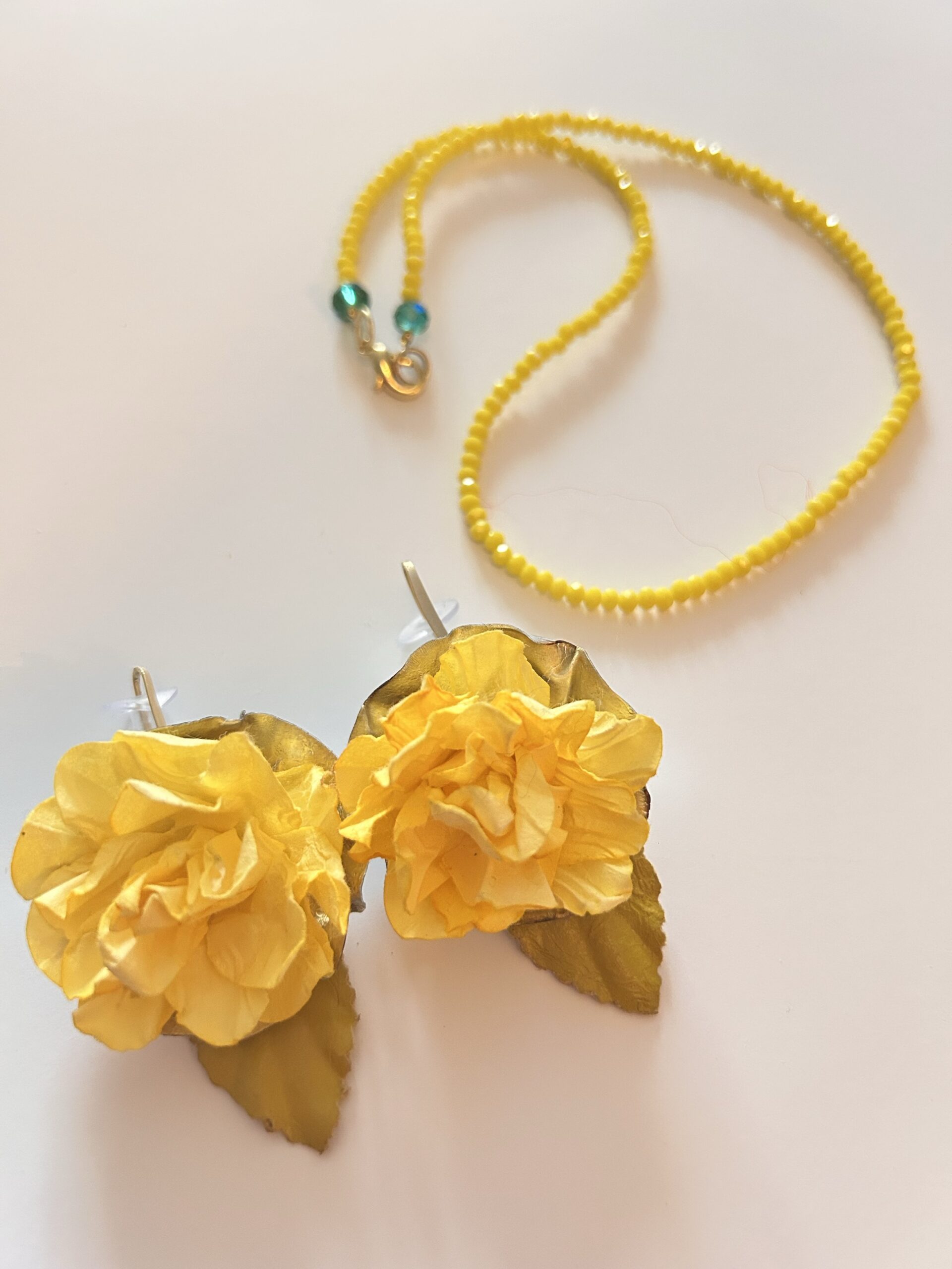 Pendientes con diseño original de ALMA Y CAPOTE. Pieza única de flor en color amarillo canario con diferentes texturas y volúmenes. El pendiente es de zamak, hipoalergénico.
